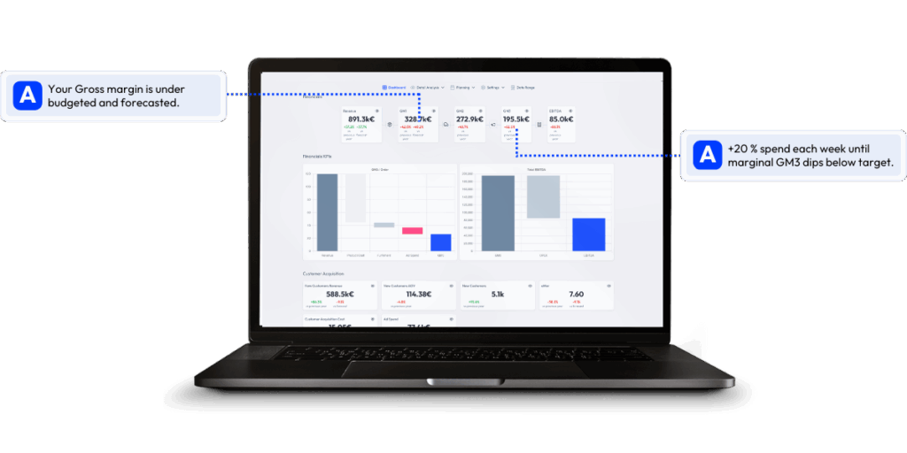 Predict and forecast sales, profitability, LTV, churn, next purchase, or optimal bidding. Helping you to know what products you will sell and how much, what your ideal spend level should be, and your nCAC and MER target.